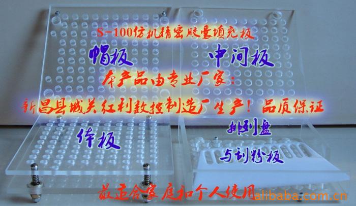 100孔胶囊填充板填充一次100粒胶囊,它由有机玻璃板加工而成的导向排列盘、帽板、中间板、体板和刮粉板组成,色泽光亮、韧性好、材料厚、可受热消毒,符合生产药品食品卫生要求;尺寸精密、使用简单、灌装快速方便、装量均匀;仿机械自动排列设计,胶囊排列速度快、自动排列率高;实行整板自动排列、整板灌装药粉、整板盖帽锁合、工效高、胶囊合格率高,是目前国内最为理想的非机械胶囊填充工具。