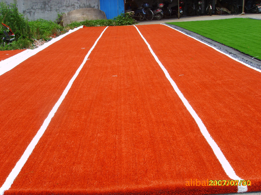 绿舒坦跑道草,由红色草纤维高密度簇绒而成,直道的白线可直接编织在红色草坪上,弯道镶嵌白线,绝无塑胶跑道发涨、凸起或脱粒等顾虑,弹性好,保护关节,充适量石英砂,在非正式比赛时是替代塑胶跑道的绝好用材。