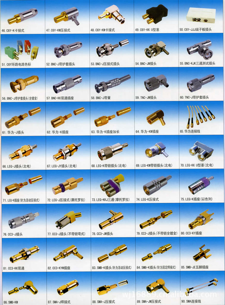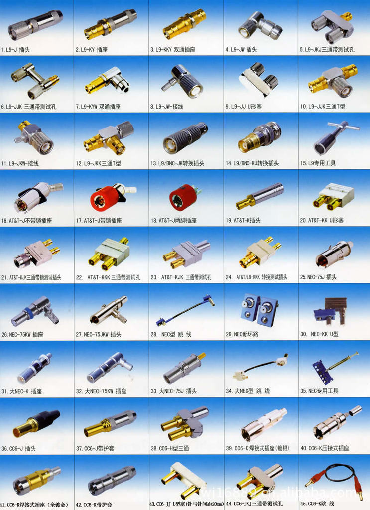 L9-J插头、L9-KY插头、L9-KKY双通插头、L9-JW插头、L9-JKJ三通带测试孔、L9-JJK三通带测试孔、L9-KYW双通插座、L9-JW-接线、L9-JJU型塞、L9-JJ三T型、L9-JKW-接线、L9-JKK三通T型、L9/BNC-JK转换插头、L9专用工具、AT&T-J不带锁插头、AT&T-J带锁插头、AT&T-J两脚插座、AT&T-K插头、AT&T-KKU型塞、AT&T-KJK三通带锁测试插头、AT&T-KKK三通带测试孔、NEC-75J插头、NEC-75KW插座、NEC-75JKM插头、NEC型跳线、NEC新环路、NEC-KKU型、大NEC-K插座、大NEC-75KW插座、大NEC-75J插头、大NEC型跳线、NEC专用工具、CC6-J插头、CC6-J带护套、CC6-H型三通、CC6-K焊接式插座(镀银)、CC6-K压接式插座、CC6-K焊接式插座(全镀金)、CC6-K带护套、CC6-JJU塞型(针与针间距20MM)、CC6-JKJ三通带测试孔、CC6-K跳线、C6Y-K卡接式、C6Y-KW压接式、C6Y-KW卡接式、C6Y-KKU型塞、C6Y-JJJ端子板插头、C6Y环路电路色标、BNC-J带护套插头、BNC-J压接式插头、BNC-JW插头、BNC-KJK三通测试插头、BNC-J带护套插头(全镀金)、BNC-KK双通插座、BNC-J带簧、TNC-JW插头、TNC-J带护套插头、华为-J插头、华为-K插头、华为-K插座加长、华为-KW插座、华为连接器、LEG-J插头(北电)、LEG-JY插头(北电)、LEG-KW带锁插头(北电)、LEG-KKU型塞(北电)、LEG-K插座(针为活动压接式)、LEG-J压接式(摩托罗拉)、LEG-K压接式、LEG-K插座(以色列)、CC3-KK双通、CC3-KYW插座、CC3-JW插头、CC3-J插头(不带锁全镀金)、CC3-KY插座、NEC专用工具,CC3-KK双通、CC3-KYW插座、SMB-K插座(针为活动压接式)、SMB-K插头(针为固定焊接式)、SMB-JE五脚插座、SMB-KW、SMA-JK焊接式、SMA-JW压接式、SMA连接式。