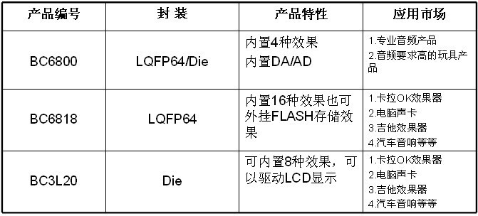 BC68XX系列芯片为24Bit、48KHz采样浮点之DSP。内置有16种声音效果,如需要更多种类则以BC68XX(DSP)+AD+DA+CPU(8051)作为平台,构建成各类混响,如:合唱、延时、镶边、弹簧、法兰、REVEB、房间、变调等。具体的效果需要懂DSP方可调用。较其它DSP来比用于范围较专业,适用于音频处理方面。在48KHZ时延时最长时则为1.92S。适用于目前大部分市场,如:调音台、吉他音箱、卡拉OK、点歌机、效果器、数码钢琴及高端家庭影院。