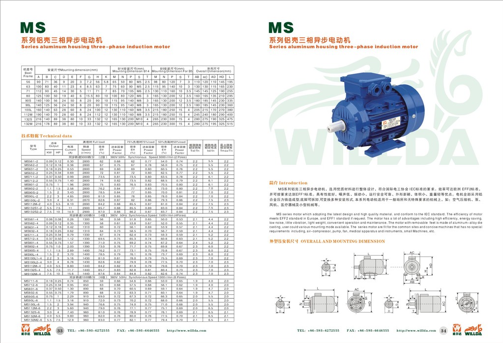 MS 系列铝壳三相异步电动机,符合国际电工协会IEC 有关标准,选用优质原材料,进行最新式整体设计。具有 性能好、噪声低、振动小、运行 安全可靠、外形美观、体 积小、重量轻、结构简单、维修方便等优点。 本系列电动机适用于一般驱动用