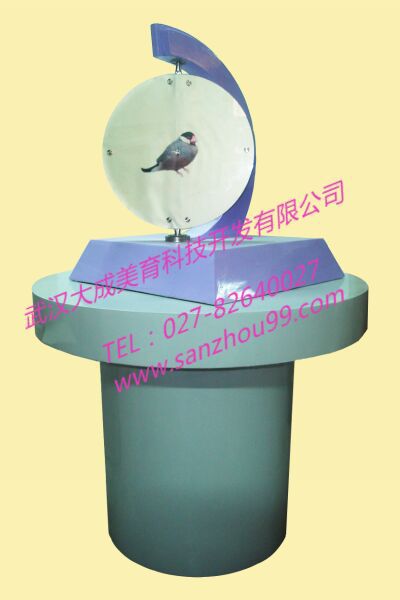 本展品利用人眼睛错觉形成使两幅画看似一幅,人眼睛可以在一分钟内分辨出十二张换底图片,但是在极短的时间连续看两张图画,眼睛就无法分辨了,而误认为是一幅。