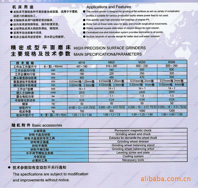 通诚平面磨床是本公司结合台湾磨床制造技术与经验的基础上,研发设计的专业产品、材质讲究、整机结构、机械原理、精度要求等方面都进行重大的研制和改进,产品做到一丝不苟,精益求精。本公司产品有M718、M820、M250、M306等型号平面磨床,分手动、液压、电动等系列产品。机床采用V型导轨、同步带传动,主轴采用超精密P4级滚珠轴承。具有操作简单方便、噪音低、加工精度高、机械性能稳定、节能效果显著、使用寿命长的特点,适用于各种模具、零件成型加工。 机床用途 本机床可磨削各种平面和复杂成型面,适用于不需机动进刀的磨削加工。 主轴轴承采用P4级精密滚动轴承。 纵向采用滚珠钢导轨,操作轻便灵活。 立柱导轨采用大跨距形导轨,刚性好。 采用手动油泵集中润滑。 机床主轴采用迷宫密封,防水防尘性能好。