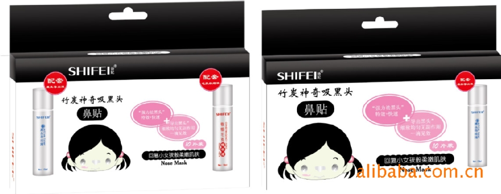 广州诗妃化妆品有限公司生产的黑头鼻贴是采用最新研究的生物化学技术成果,结合人体的生理特点研制而成。主要成分是一种人工汗液,其原理是人在出汗时毛孔会张开,其中含有的特殊乳化剂可将黑头的油脂乳化使之溶胀,软化老化的角质层,从而促使黑头乳化浮出皮肤表面,鼻贴中的胶性成分将黑头牢固地粘住,从而轻松、彻底地将黑头从鼻头中拔除。简简单单清除黑头烦恼。连续使用可令毛