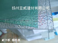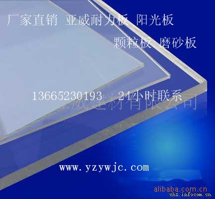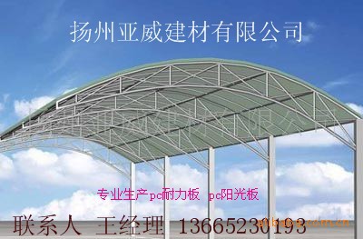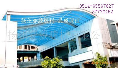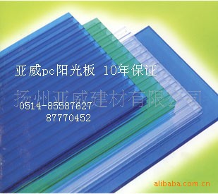 亚威10年PC阳光板,耐力板,pc板,PC阳光板, PC耐力板,PC声屏障专用板产品特性: (1)透光性:P C板透光率最高可达89%,可与玻璃相妣美。UV涂层板在太阳光下爆晒不会产生黄变,雾化,透光不佳,十年后透光流失仅为6%,PVC流失率则高达15%—20%,玻璃纤维为12%-20%。 (2)抗撞击:撞击强度是普通玻璃的250-300倍,同等厚度亚克力板的30倍,是钢化玻璃的2-20倍,用3kg锤以下两米坠下也无裂痕,有“不碎玻璃”和“响钢”的美称。 (3)重量轻:比重仅为玻璃的一半,节省运输、搬卸、安装以及支撑框架的成本。 (4)阻燃:国家标准GB50222—95确认,PC板为难燃一级,即B1级。PC板自身燃点是580摄氏度,离火后自熄,燃烧时不会产生有毒气体,不会助长火势的蔓延。 (5)防紫外线:PC板一面镀有抗紫外线(UV)涂层,另一面具有抗冷凝处理,集抗紫外线、隔热防滴露功能于一身。可阻挡紫外线穿过,及适合保护贵重艺术品及展品,使其不受紫外线破坏,防紫外线(UV)保护膜 太阳辐射对聚合物材料有明确害处,会使表面产生细纹引起降解。这些细纹易受水,尘和水化学物质和侵蚀。这些对聚合物的影响程度很大程度上程度上依赖于环境参数如地理位置,海拔高度和季节变化等。宏盛板材有单面或双面的紫外线保护层,有良好的室外耐侯性能。这种独特的保护保证长期在强烈的紫外线强光照射下,仍能长期使用并保持其光学特性,与其他热塑形材料相比。 (6)可弯曲性:可依设计图在工地现场采用冷弯方式,安装成拱形,半圆形顶和窗。最小弯曲半径为采用板厚度的175倍,亦可热弯。 (7)隔音性:PC板隔音效果明显,比同等厚度的玻璃和亚加力板有更佳的音,响绝缘性,在厚度相同的条件下,PC板的隔声量比玻璃提高3—4DB。在国际上是高速公路隔音屏障的首选材料。 (8)节能性:夏天保凉,冬天保温,PC板有更低于普通玻璃和其它塑料的热导率(K值),隔热效果比同等玻璃高7%-25%,PC板的隔热最高至49%。从而使热量损失大大降低,用于有暖设备的建筑,属环保材料。 (9)温度适应性:PC板在-100摄氏度时不发生冷脆,在135摄氏度时不软化,在恶劣的环境中其力学,机械性能等均无明显变化。 (10)耐候性: PC板可以在-40℃至120℃范围保持各项物理指标的稳定性。人工气候老化试验4000小时,黄变度为2,透光率降低值仅0.6%。 (11)防结露: 室外温度为0℃,室内温度为23℃,室内相对湿度低于80%时,材料的内表面不结露。供应阳光板价格报价,耐力板价格报价,pc板价格报价亚威PC耐力板产品性能(一)机械性能1、抗冲击强度:PC耐力板抗冲击性能极佳,它比传统玻璃高250倍,比亚克力板材高30倍。Pc耐力板的冲击强度有如“透明钢板”之称。2、拉伸强度好,PC耐力板耐热性佳,即使在120℃,其拉伸强度仍可达350kgf/cm2。3、弯曲强度:PC耐力板抗弯性良好,即使弯曲角度达90°,仍不断裂。4、抗疲劳与抗蠕变性:PC耐力板抗蠕变性在热塑性塑胶中是最好的。即使在高温下其蠕变仍很小。(二)热性能1、熔形温度:PC耐力板熔形温度135℃,其连续使用温度达120℃。2、线膨胀系数:线膨胀系数为7×10-5cm/cm/℃在塑胶中属较小的。3、脆化温度:PC耐力板脆化温度为-40℃,最低连续使用温度为-30℃,是一般塑胶不可比的。4、燃烧性:PC耐力板属难燃自熄性塑胶之一,其在高温加热时不会产生有毒气体。5、热传导率:PC耐力板的热导率与一般塑胶差异不大,是玻璃的1/4,铁的1/300,铝的1/1000,铜的1/2000,属保温性能优良的材料之一。(三)光学性能1、透光率:PC耐力板的透光率为85%以上与玻璃相当。2、耐候性:一般PC耐力板材长期暴露室外,受紫外线照射易引起黄变及表层劣化。亚威PC耐力板表面附有一层抗UV层,即使长期暴露室外,其光学,机械性能均无显著变化。(四)隔音亚威PC耐力板隔音效果比玻璃高3-4DB,是目前高速公路隔音屏障的首选材料.亚威PC耐力板已被天津轻轨工程、武汉轻轨工程以及全国很多城市道路隔音屏上选用。(五)抗化学性聚碳酸酯在常温下对弱酸、弱碱及醇类的抵抗性能良好,但对强酸碱、苯类、氯化烃类和酯类的抵抗性能稍差,极易产生溶解、溶胀或分解的现象。由于其抗化学性与温度高低、内部残留应力大小及暴露时间长短有关,故使用前应特别注意。(详见PC耐力板与不相容化学物说明)(六)重量轻在相同厚度及面积下,PC耐力板重量仅为玻璃的一半,因此可大量节省搬运与施工的难度与运费。