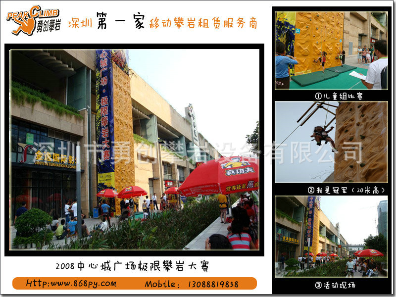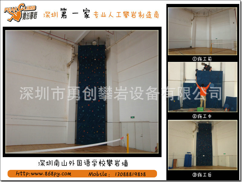 深圳市勇创攀岩设备有限公司 是从事体育休闲产业设施的专业供应商.自成立以来,就一直与世界顶级体育设施供应商紧密合作,积累了丰富的产品和实际营造经验,不断地推出符合国际发展趋势和国内用户需求的新产品,确保公司在该领域处于领先地位。它是深圳第一家专业从事人工攀岩制造商,是深圳唯一拥有移动攀岩墙设施租赁的公司.