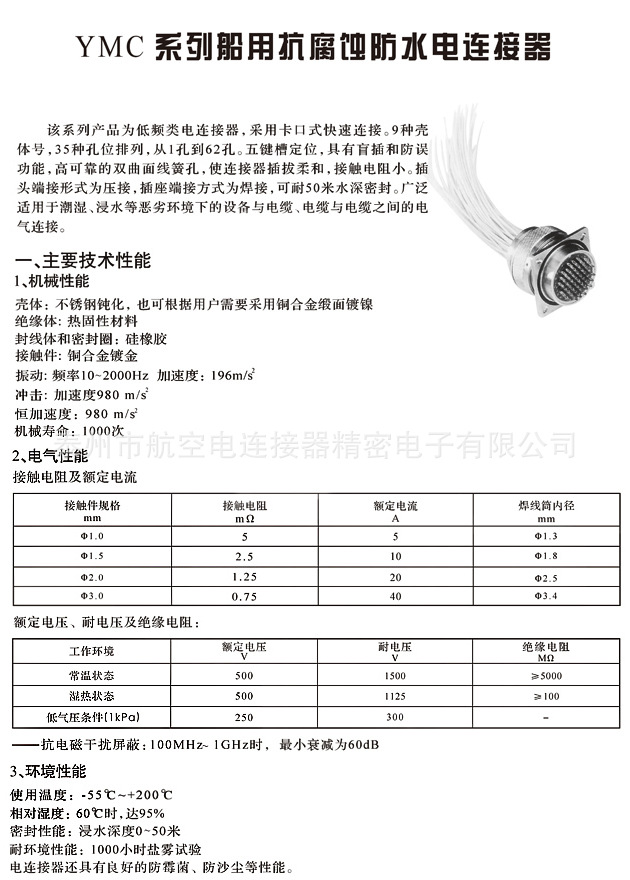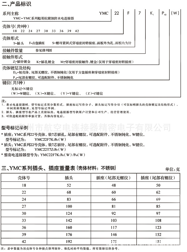 YMC22F7KP40/P40不锈钢航空插头,适用于湿热,浸水等恶劣环境,可耐50米水深密封,耐1000小时盐雾试验;卡口式快速连接,插头为压接,插座为焊接。