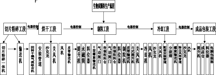 木屑颗粒机成套生产线,配置为:切片、粉碎、烘干、制粒、冷却、分筛、包装(工段)。