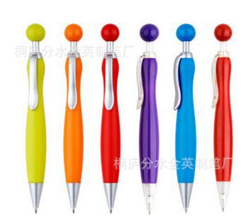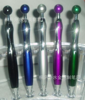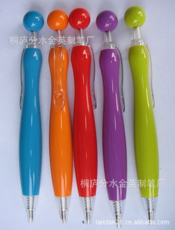 俗称圆珠笔。所使用的笔头球珠多采用不锈钢或硬质合金材料制成。球珠直径的大小,决定了字迹线条的粗细。常见的球珠直径有1毫米、0.7毫米、0.5毫米三种(产品的笔身或圆珠笔芯上往往会注明)。圆珠笔的油墨是特制的,主要以色料、溶剂和调黏剂混合而成。常见的颜色有蓝、黑、红三色。普通油墨多用来作一般书写,特种油墨多用来作档案书写。作档案书写用的油墨,在笔芯上一般注有记号,如国产笔芯就注有DA的字样。