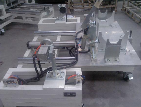 结构说明工作台由可移动的支架平台、工件支架移动滑台、工件定位机构、端口封堵结构、氧传感器或温度传感器的端口封堵机构、操作按钮箱、安全围栏等构成。