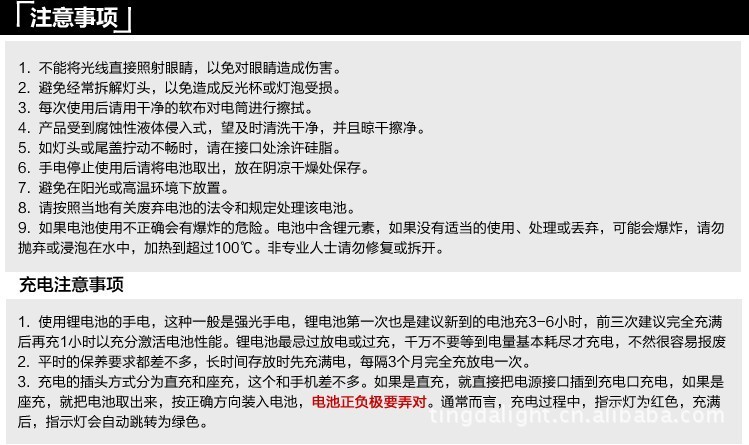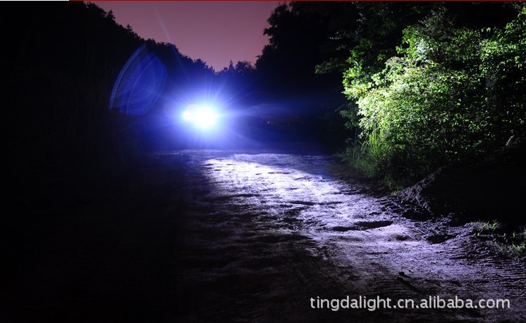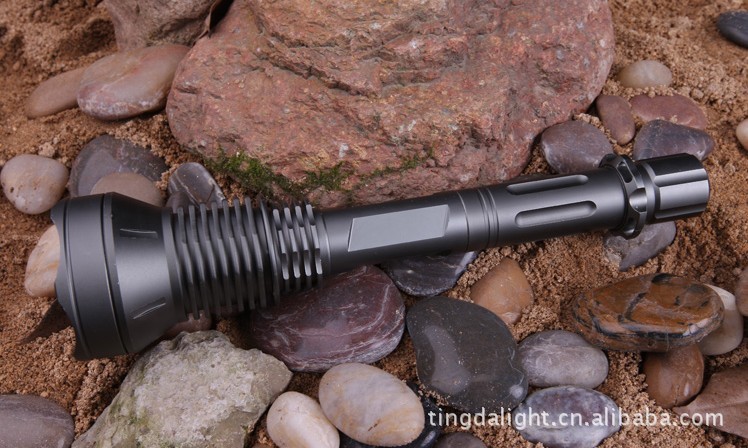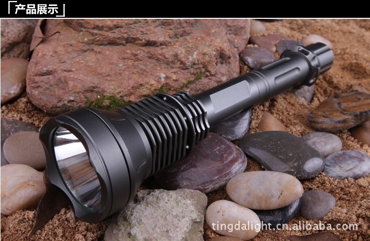 超强光2300流明铝合金手电筒采用最新的美国流明公司SST-90大功率LED灯,亮度可达2300流明;5档电流智能数字线路控制; (1).强光:工作电流 6500mAh,亮度 2300 流明; (2).中档:工作电流 2000mAh,亮度 1500 流明; (3).低档:工作电流 800mAh,亮度 500 流明; (4).闪光:工作电流 5000mAh,亮度 2000 流明; (5).SOS模式:工作电流 6500mAh,亮度 2300 流明;全金属材料桔皮效果反光杯,耐高温不散光,避免黑斑和不聚光;材料:T6061航空铝合金,全CNC高精度加工;采用3颗18650可充电锂电池充电;连续工作时间超过1小时;O型圈防水设计