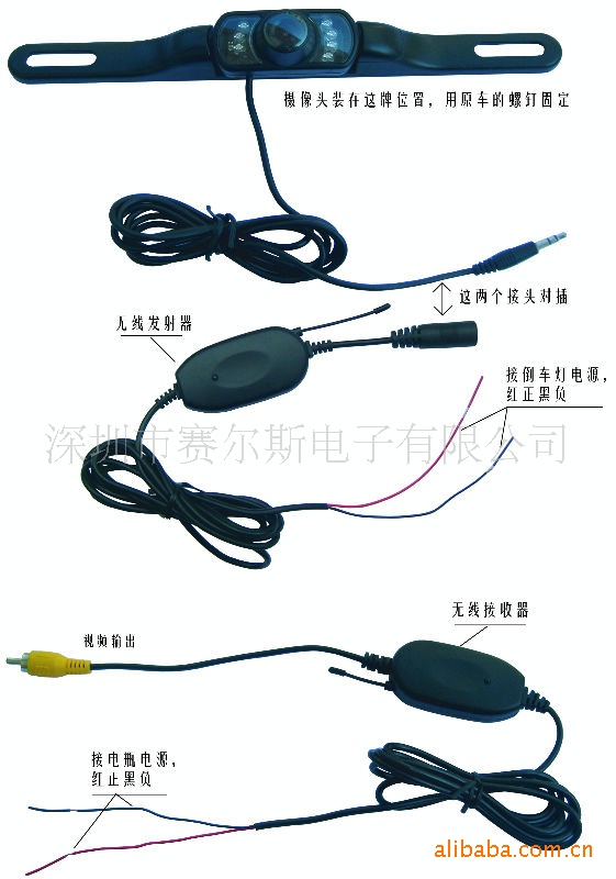 >匹配现有GPS增加无线可视倒车功能,30万有效像素,画面清晰稳定。 >110度超宽视角,画面更加宽广。 >低照度感光芯片,夜间有效可视距离可达2米。 >防水防尘结构设计,防水等级达到IP65。 >便捷车牌安装方式,适合小车、巴士以及卡车。 >标准车充电源接口,迷你USB电源接口设计。 | 参数表: | | 项目 | 参数 | | 传输频率 | | ISM 2,400~2,483 MHz 4频点* | | 调制方式 | | FM | | 天线 | | 全向天线 | | 传输距离 | | 1500m | | 工作温度 | | -10℃~ +50℃/ +14 ~ +122F | | 存储温度 | | -20℃~ +60℃/ -4 ~ +140F | | 工作湿度 | | 85%RH | 转换模块 | 电源 | DC 5V 500mA | | 尺寸 | 56mm*33mm | | 重量 | 30g | 接收机 | 接收灵敏度 | ≤-85dBm | | 天线接口 | 50ohm SMA | | 电源 | DC 12V 500mA | | 消耗电流 | 200mA | | 视频输出 | 1Vp-p@75ohm | | 音频输出 | 1Vp-p@600ohm | | 重量 | 25g |