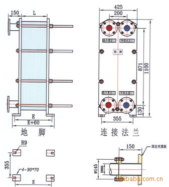 框架包括一个固定压紧板和一个活动压紧板,由上导杆与下导杆支承,在另‘端有一支柱。压制成的波纹板片悬挂在两板之间的上导杆上,移动活动压紧板将板片组压紧,再用一组夹紧螺柱将固定压紧板和活动压紧板夹紧至一定尺寸。两种介质经固定(或活动)压紧板上法兰孔流入由波纹板片组成的各自通道,热交换后介质再由固定(或活动)压紧板上的法兰孔流出。同定压紧板、活动压紧板、支柱及导杆均为低碳钢。考虑到用户的多种使用要求,框架设计有多种型式,主要有双支撑框架式和常用的落地式等,也可根据用户的要求更改框架的型式。