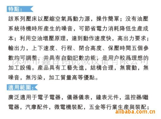 2、 该系列压床以压缩空气为动力源,操作简单,没有油压系统待机时所产生的噪音,可节省电力消耗降低生产成本;利用空油增压原理,达到动作速度快,高出力要求;输出力,上下速度、行程、闭合高度、保压时间五个参数均可调整,并具有自动记数功能,是用户较为理想的加工设备。产品具有工艺先进,结构合理,无震动,无噪音,无污染,加工质量高等优点。