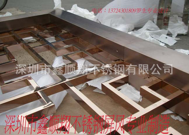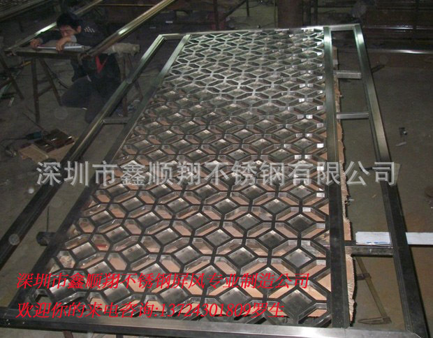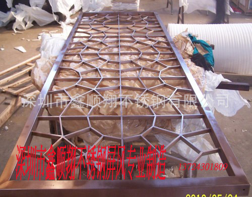 我司生产的屏风款式主要有仿古屏风、工艺屏风、古典屏风,彩色不锈钢激光镂空屏风等。屏风颜色主要有玫瑰金、钛金、香槟金、古铜、黑钛、枪黑、天蓝、紫红、茶色、褐色等。屏风选用不锈钢材质(201,304等),外框刨槽,外框及面板采用拉丝,镀钛,抛光等技术,经久耐用,而且清洁方便,长时间使用亮泽如新。.目前已为各宾馆、酒店、茶艺馆、高品位办公及家庭的装点装饰等提供高品质的屏风。愿以优质的服务,专业的技术为您量身定做合格、满意的屏风。