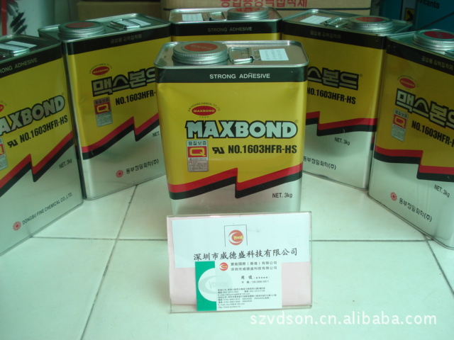 1603黄胶也就是UL黄胶,是韩国东部精密化学生产的品牌为 MAXBOND 中的一种。型号为:1603HFR-HS。它进一步提高了以前产品的电性能和热阻,它是一种由氯丁二烯组成的符合UL 94V-0标准的高阻燃级别胶水,它在常温下就能进行粘接,只要施加小小的压制他就会表现出很强的粘接力。