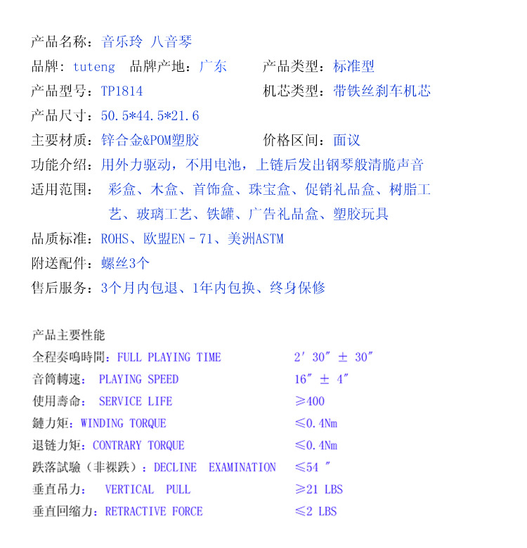 深圳市图腾音乐机芯有限公司是一家专业开发、生产、销售八音琴、音乐机芯、玩具配件等为一体的公司,可提供上千首音乐铃八音琴曲名——圣诞、儿歌、流行歌曲,并可根据客户要求,提供母带进行录音、研发。 欢迎来图、来样开发、生产。