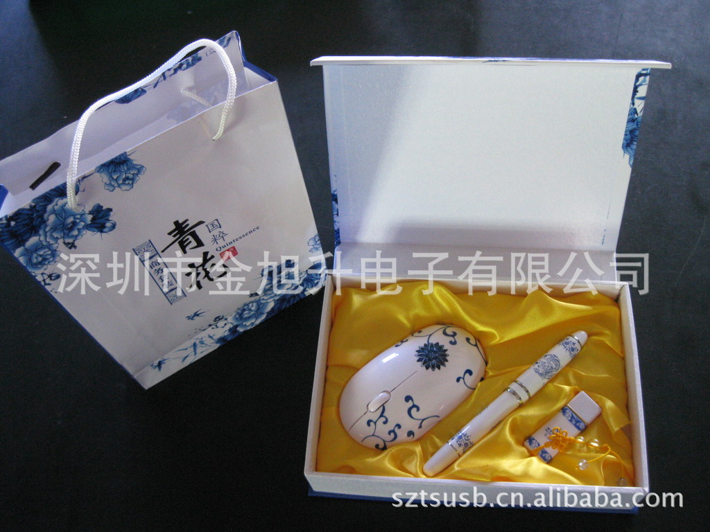 1、青花瓷套装可配青花瓷U盘(1GB~64GB可选,可选配青花龙或青花凤,价格不变)2、青花瓷签字笔(有分签字笔,钢笔)3.青花名片盒,青花书签,青花无线鼠标等,可按客人喜欢的款式自由组合,产品外观新颖,小巧方便携带,重量轻,体积小作用大,完全能满足出差旅行的朋友,不管是自己用还是送客户,送朋友,商务馈赠都是最佳选择!