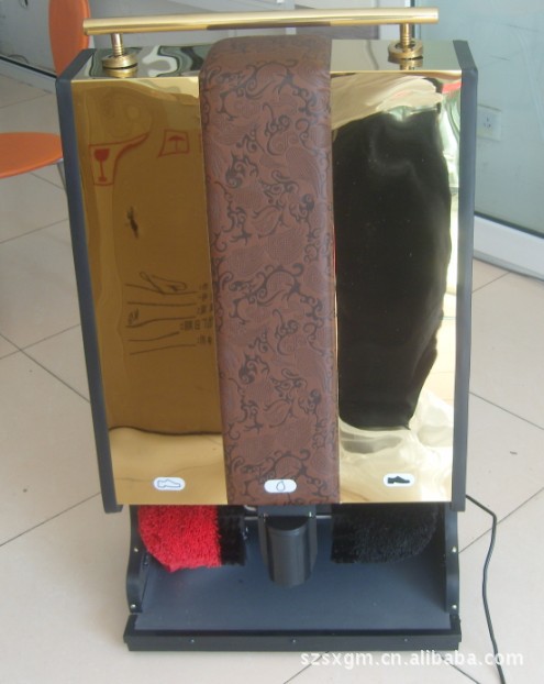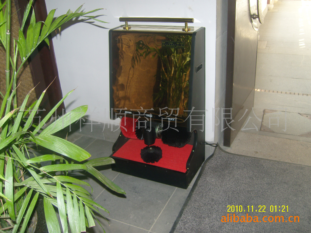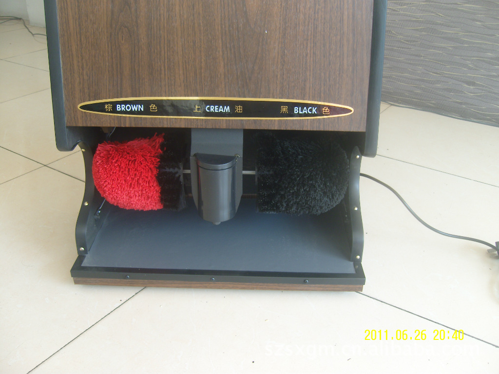 供应新款擦鞋机,公用擦鞋机品牌直销,自动感应擦鞋机一、应用的先进技术1专用无色光油使鞋面光泽亮丽,防霉,防硬化,保护鞋革;2采用国际先进的红外线遥感技术,具有超强的抗干扰能力,接通电后。只需伸脚即可。3擦鞋过程仅需要几分钟,经擦灰、上油、擦亮鞋面即明亮如新,随时护理让皮鞋保持清洁。4内设自动休眠装置,感应启动,休眠状态下耗电量几乎为零。 该擦鞋机为感应式启动,只须将脚伸入轮刷下,机器即自动开始工作,脚拿出即自动停机二、擦鞋机优势