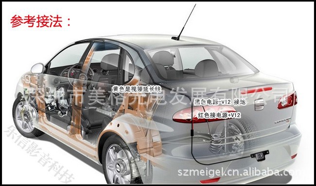 8、视频线接监视器,电源线接汽车尾灯电源。倒车时,倒车监视系统自动开始工作,可以清晰看见车后的情况。