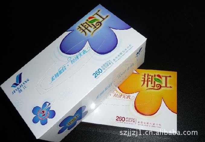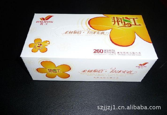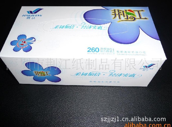 荆江盒装抽取式纸巾,纸质:纯木浆(维达纸),规格:18*20cm 2层100抽,包装:5盒/条,50盒/件,纸盒材质:400克灰卡纸过油磨光 ,包装精美。