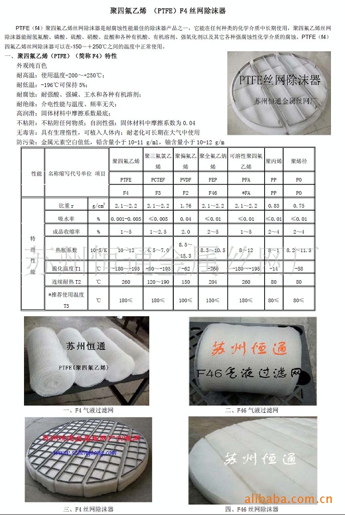 PTFE(f4)聚四氟乙烯丝网除沫器是耐腐蚀性能的除沫器产品之一,它能在任何种类的化学介质中长期使用,聚四氟乙烯丝网除沫器能耐氢氟酸、磷酸、硫酸、硝酸、盐酸和各种有机酸、有机溶剂、强氧化剂以及其它各种强腐蚀性化学介质的腐蚀。PTFE(f4)四氟乙烯丝网除沫器可以在-150~+250℃之间的温度中正常使用。