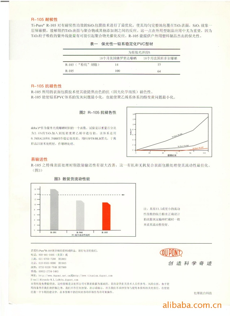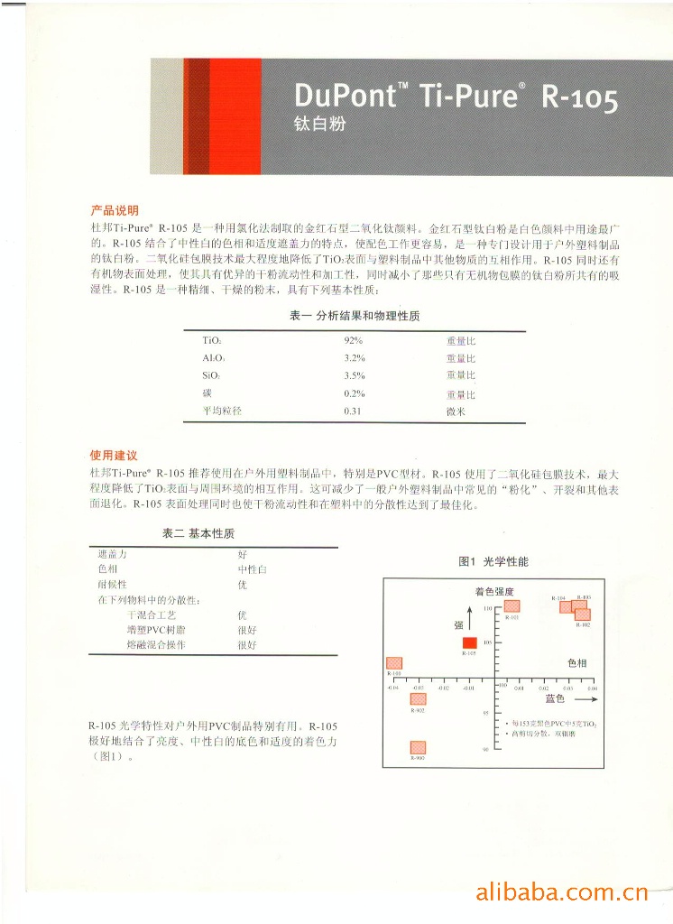 沈阳东方昊炅有限公司是美国杜邦公司顶级合作伙伴,现供应美国杜邦钛白粉R-105。杜邦R-105是一种用氯化法知趣的金红石型二氧化钛颜料。金红石型钛白粉是白色颜料中用途最广的。R-105结合了中兴白的色相和适度遮盖力的特点,使配色工作更容易,是一种专门设计用于户外塑料制品的钛白粉。
