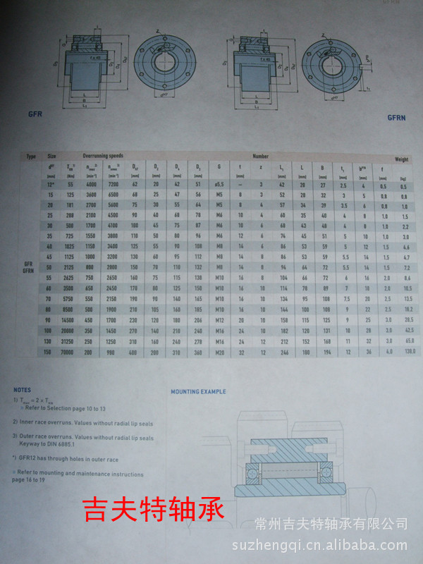 型号gfr,gfrn为滚柱型式单向离合器,有轴承支撑,使用2只160系列之滚珠轴承,须要附加润滑油,此型号可以下之设计方式,安装时加注润滑油及油封,此型号轴承不可承受轴向应力。典型应用例上,型号gfr,gfrn与f系列法兰盖及密封盖组合使用于扭力传输,油脂润滑与油封,一般而言这些法兰盖与密封盖为成双使用的,不同组合方式请参考其下型号之说明。gfr型号之外环为光滑面,以固定中心线并与h7孔公差的工作