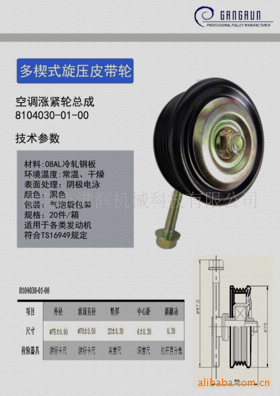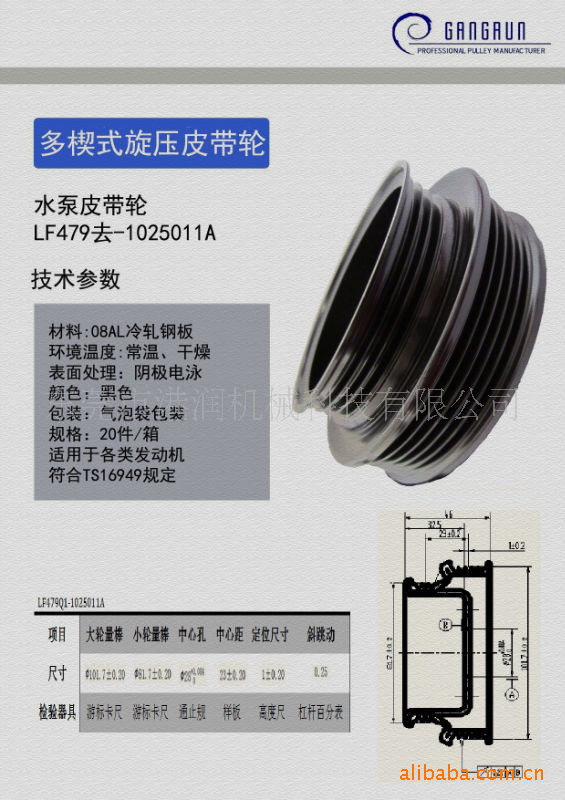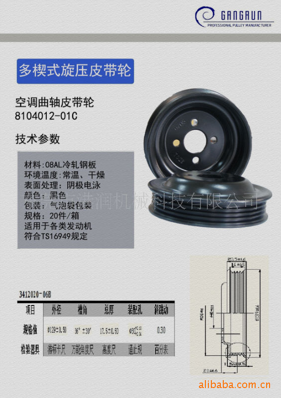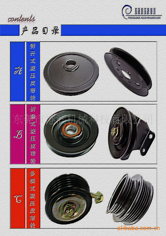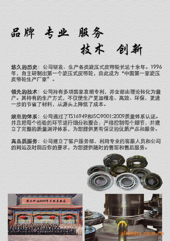 各类旋压式皮带轮为我公司的主要产品之一,我公司利用旋压技术生产各类皮带轮十余年。在此期间,获得了行业中的广泛好评,享有了高度的行业影响力,并且与多家整车厂、发动机厂、空调压缩机厂等生产厂家形成了长期的、稳定的合作关系。我公司利用先进的生产技术、积极的进行工艺革新,从而降低了产品的成本,并且组建了专门的团队直接负责产品的工艺创新与管理。同时,我公司拥有健全的质量管理体系,通过了ISO9001产品质量体系认证与ISO/TS16949:2009全球汽车质量管理体系认证,进而保证了公司生产的每件产品都拥有优质的品质。公司能够长期、稳定的生产各类旋压式皮带轮,凡是我公司生产的产品能够真正做到质优、价廉,并拥有其他厂家无法比拟的竞争优势。