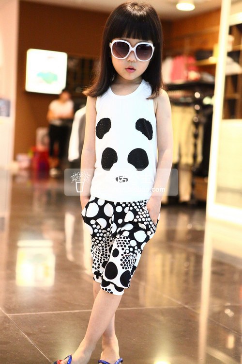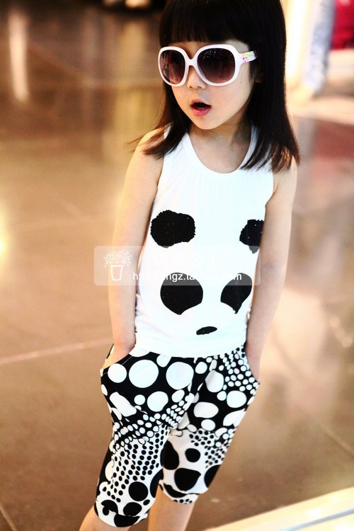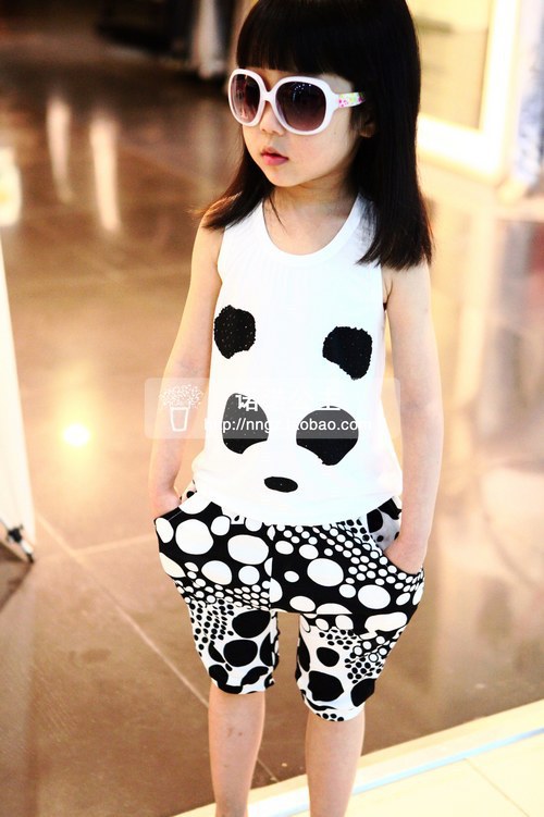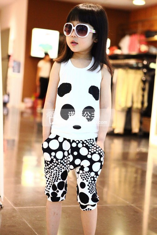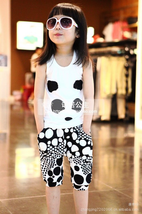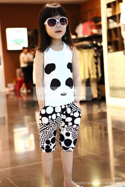 厂家直销 2013女童装夏款 可爱熊猫无袖中小童套装