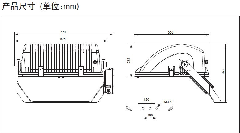 • 支架安装,进线采用防水接头M20,更换光源只需开启高弹性搭扣和铰链固定的前置玻璃,而不改变灯具的投射方向