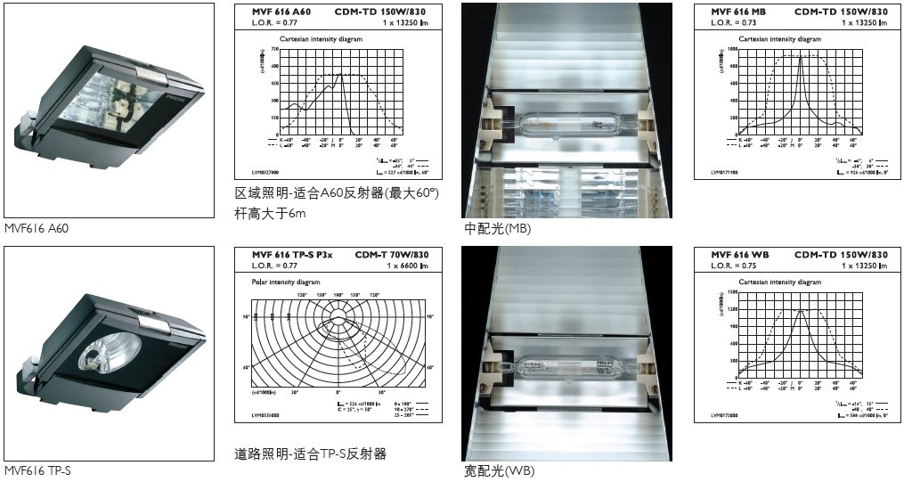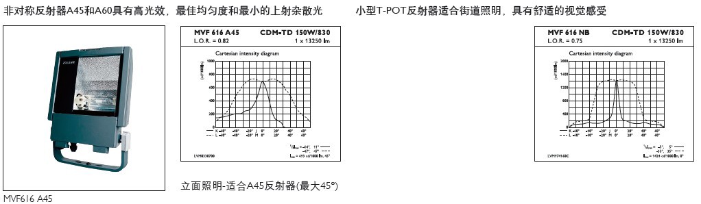 • 三种对称反射器提供窄(NB)中(MB)和宽(WB)配光;两种非对称反射器(A 45º/60º)适合立面和区域照明;一种路灯小型反射器CT-POT(TP-S) 适合城市道路照明