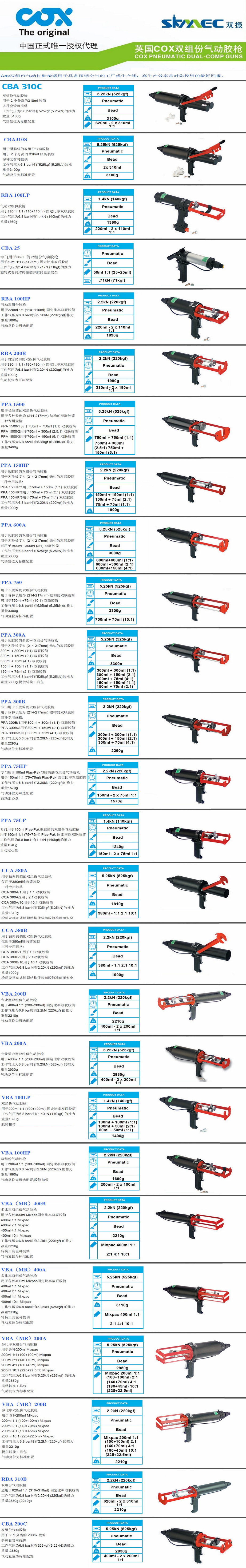 以上是专业代理英国进口双组份气动胶枪的详细信息,如果您对专业代理英国进口双组份气动胶枪的价格、厂家、型号、图片有什么疑问,请联系我们获取专业代理英国进口双组份气动胶枪的最新信息。 所有COX胶枪均按高标准设计及制造以确保经久耐用,使用寿命是仿冒品的十倍以上。COX系列胶枪目前占有全球70%以上的出口量,很多知名外资企业都指定使用COX品牌系列胶枪。