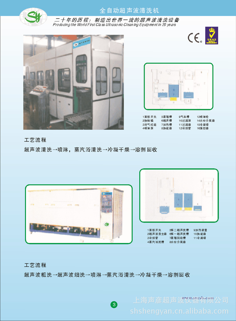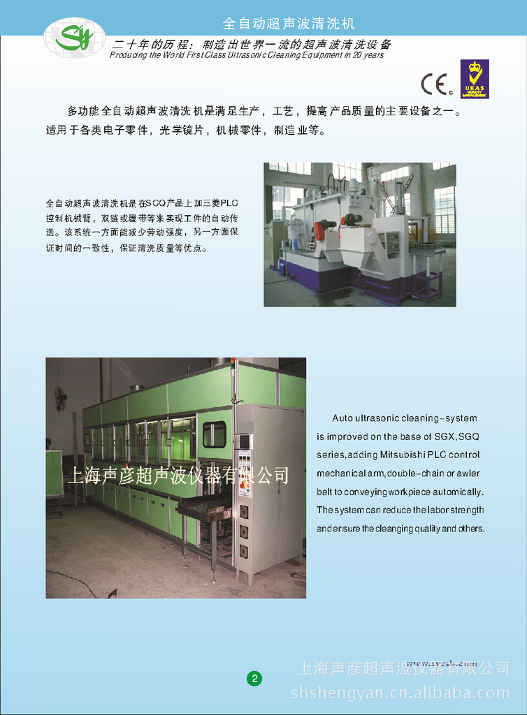 公司按国际标准组织生产的声彦牌系列台式,分体式,组合式,投入式,单槽式,双槽式,三槽式,五槽式和多槽式,单频和双频超声波清洗机,超声波焊接设备,超声波细胞粉碎设备,超声波恒温水浴设备,超声波测厚仪设备等。公司仪器采用目前国际上最先进的晶体管,IGBT和集成电路,微处理电路保护电路及数码显示,使仪器结构新颖,电路先进,工作可靠,高效率,低噪音及清洗清洁度高的特点。广泛应用电子器件,液晶显示,半导体硅片,电路板,电镀件,光学镜片,音频磁斗,涤纶过滤芯,化纤喷丝头,手术器械,通讯器械,玻璃器材,照明器具,消防器材,不锈钢制品,眼镜零件,金银首饰,钟表零件,缝纫机零件,精密机械零件,液压件,五金工具,三通阀,轴承,轴瓦,油咀,油泵,化油器,喷油嘴,缸头,缸盖,缸件,汽车零配件的清洗,除油,除锈,除碳及各种材料表面处理,特别对深孔,盲孔凹凸槽的清洗是最理想的设备。同时在生物,化学,医学,物理,科研及大专院校的实验中可作提取,乳化,脱气,均匀,细胞粉碎之用。公司可根据客户要求设计生产各种行业的非标专业清洗设备,细胞粉碎设备,焊接设备,恒温水槽设备及测厚仪设备。