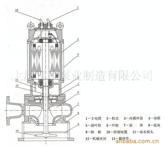 ■适用范围 | | JPWQ系列自动搅匀潜水排污泵适用用于工厂商业严重污染废水的排放、主宅区的污水排污站、城市污水处理厂派水系统、人防系统排水站、自来水厂的给水设备、医院、宾馆的污水排放、市政工程建筑工地、矿山配套附机、农村沼气池、农田灌溉等行业,输送带颗粒的污水,污物,也可用于清水及带弱腐蚀性介质。 | | ■使用条件 | | 1、搅匀潜水排污泵系列产品在额定电压为380V,电源频率为50Hz时适用 2、介质温度不超过40摄氏度,介质密度≤1150kg/m3,PH值在5-9范围之间; 3、海拔高度不超过1000米; 4、输送介质年粘度不超1000CP; 5、产品工作运行时必须完全潜入水中,但潜水深度不得超过10m; 6、产品材质主要为铸铁,不能用于强腐蚀性或含有强腐蚀性的介质中; 注意:在选型或安装使用前务必使泵实际使用条件符合以上条款,确保产品的正确使用! | | ■产品特点 | | 1、采用双叶片叶轮结构,大大提高了污物的通过能力 2、机械密封采用新型磨檫副,并长期处入油室内运行; 3、整体结构紧凑、体积小、噪声小、节能效果显著,检修方便,方便用户更换; 4、自动控制柜可以根据所需液位变化,自动控制泵的超动与停止,不需专人看管,使用极为方便; 5、可根据用户需要配备安装方式,它给安装、维修到来极大的方便,人可不必此为而进入污水坑; 6、能够在设计范围内使用,而保证电机不会过载; 一、结构特点说明 1、采用独特的双流道无堵塞叶轮结构,提高污水污物的过流能力和排污能力。 2、自动搅拌装置,产生极强的搅拌力,将池内的沉淀物搅拌成悬浮物后吸入叶轮排出,达到清淤的作用。 3、隔板将底座一分为二,搅拌与进水互不影响。 4、机械密封为双端面机械密封,长期处于油室中,保证水泵安全可靠地运行。 5、副叶轮结构的流体动力密封,既有辅助密封作用,从而保护机械密封,又平衡轴向力, 延长轴承的使用寿命。 6、泵接线腔内设有漏水检测探头,出现漏水时,探头发出信号,控制系统对泵实施保护。本公司可配全自动安全保护控制柜。 7、电机定子采用B级和F级绝缘,内设热保护器,当电机过载发热,保护器及时作出动作, 对泵和电机实施绝对的保护。 8、油室内装有油水探头,当机械密封损坏后,水进入油室,探头发出信号,由控制系统对水泵实施保护。 9、JPYQ带内循环冷却系统,能保证水泵在水池最低水位正常工作。 二、JYWQ型自动搅匀潜水排污泵(结构图)
