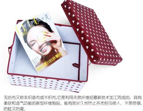 材 质:优质无纺布,经过高温处理,可以防霉,防潮,抗菌。内衬为硬纸板。