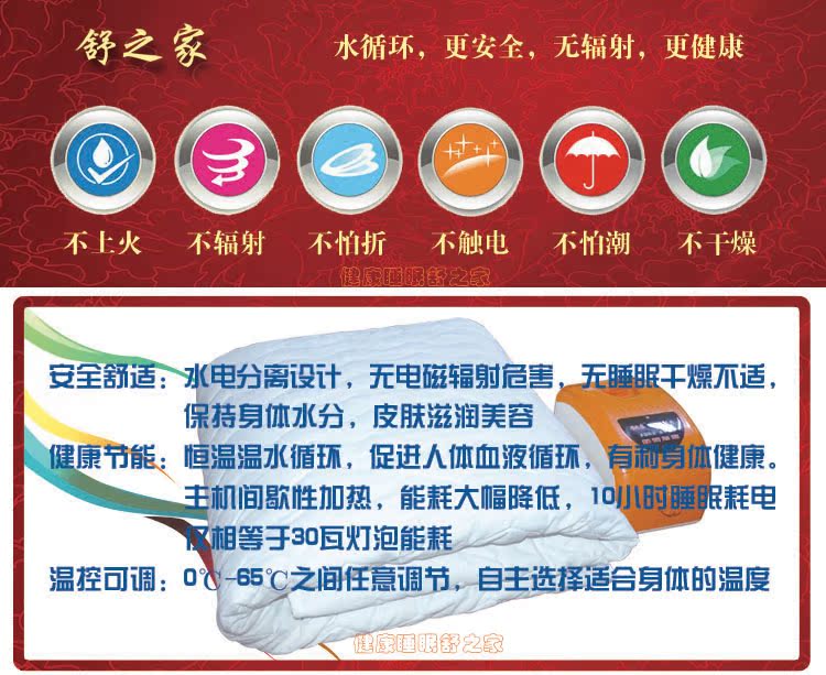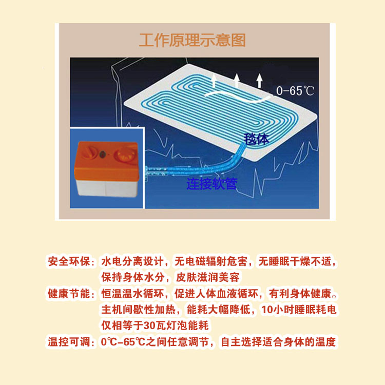 4.打开主机水盖,加注纯净水,水位到达刻度中间线为宜。打开电源开关,指示灯亮,主机开始工作。随着水往毯体内循环,水位刻度逐渐下降,这时请继续加注纯净水直至水位稳定。