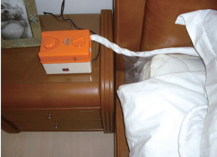 3.放平主机,检查水管是否有脱落现象,主机与毯体连接处为床尾,主机与床面高度不超过40cm。主机与毯体位于同一水平面上效果最佳。
