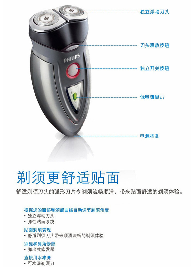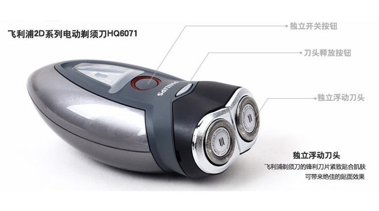 基本信息品牌:飞利浦 型号:HQ6071剃须时间:13天 替换刀头:两年更换一次HQ8剃须刀头使用时间:40分钟 面部轮廓跟踪:弹性贴面系统显示屏:充电指示灯 刀头:独立浮动刀头清洁:水洗设计 美发造型:精确修发器维修:全国联保2年