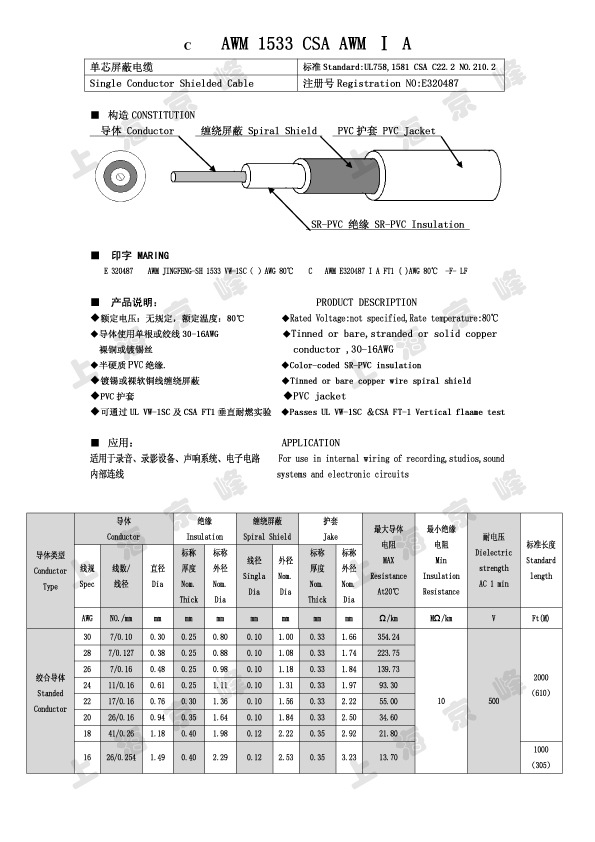 导体使用单根或绞线30-16AWG裸铜或镀锡丝