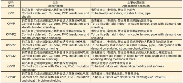 ①用户需要阻燃型产品,上述型号均可生产供货,只要在型号前加”ZR-”,如:ZR-KVV型等。