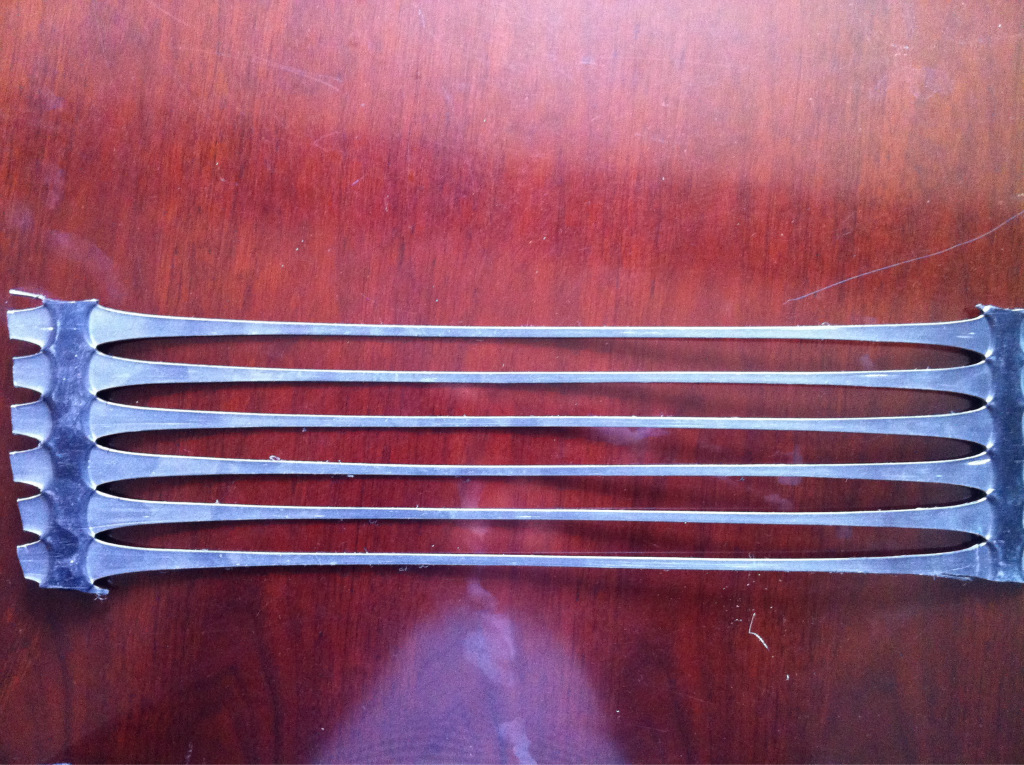 单向拉伸的土工格栅是由高分子聚合物经挤出压成薄板再冲规则孔网,然后纵向拉伸而成。这种过程中使高分子成定向线性状态并形成分布均匀、节点强度高的长椭圆形网状整体性结构。此种结构具有相当高的拉伸强度和拉伸模量,给土壤提供了理想的力的承担和扩散的连锁系统。是目前广为采用的加筋加固材料。