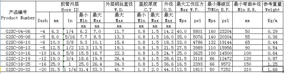 应 用:较小弯曲半径的高压液压油基和水基液压系统。优异的脉冲和超过SAE100R2和SAE100R16标准要求的弯曲性能。胶管拥有更加紧凑的尺寸和较小的弯曲半径,比2SN胶管在机械装配上有更好的性能。