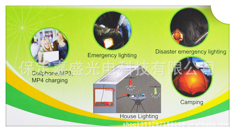 * 独立太阳能照明组件内置高容量及长寿命蓄电池, 非常方便于家庭照明, 露营照明及户外活动照明, 特别适合偏远地区, 山地地区, 沙漠地区, 草原地带, 村落, 乡村及其它供电短缺地区;