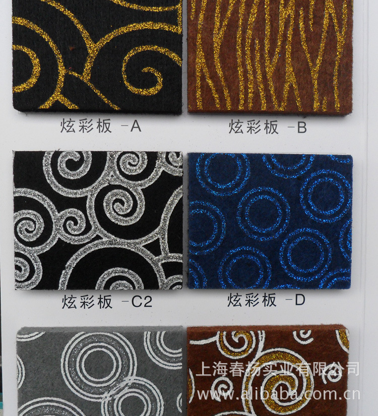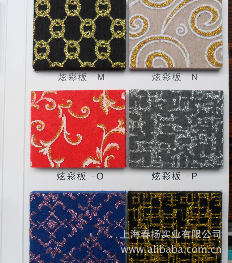 春扬聚酯纤维装饰艺术板:是由100%聚酯纤维为原料,经过热压合以茧棉状制成的。利用热处理公法来实现密度多样确保通风性,使之成为吸音材料、饰面材料、隔热材料中的优秀产品。本产品接近自然,对人体无害,能创造一个安静舒适的工作生活空间。装饰性强,施工简单,能通过木工机具,变换多种造型。色彩花型丰富,可直接做装饰面材料,还可根据不同的需要做各类涂料喷涂,可代替以往层板加海绵或玻璃纤维的传统软包布艺。 “春扬”吸音板与一般胶合板大小不同,长宽分别为2.42m×1.22m,厚9mm. “春扬”聚脂纤维吸音板与其他建筑材料的比较: