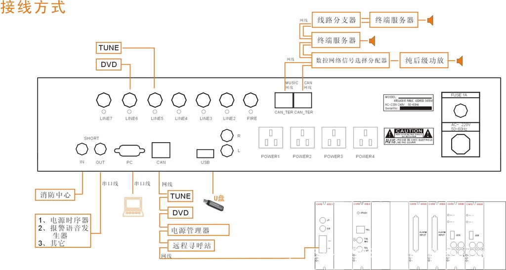 6、可外接电话输入器,进行远程电话分区、分组、全区广播。电话有语音提示。