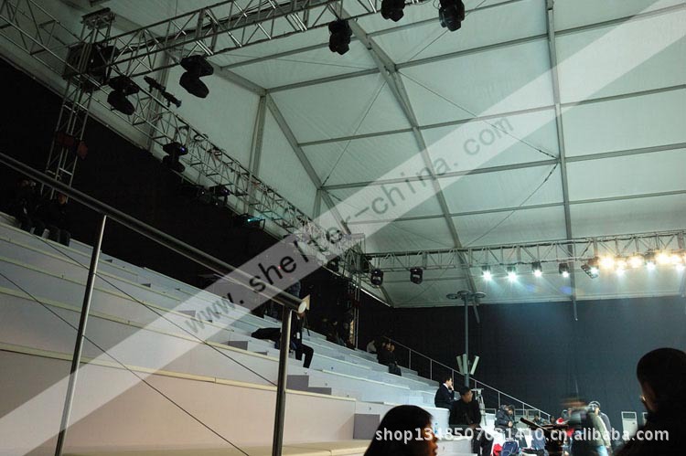 赛尔特户外体育运动赛事篷房(帐篷)采用高强度铝合金型材(材质6061/T6)作为结构支架,篷布采用阻燃的双面PVC合成纤维布,具有抗风、防水、防火、防紫外线的优良性能,安全可靠性完全达到德国同类产品的标准,抗风速可达80-100公里/小时(风载荷0.3-0.5千牛/平方米)。加上完善的配套设施,如篷内天花布幔、ABS硬体墙、玻璃墙、玻璃门、空调、木地板、地毯和舞台灯光音响等设施,使篷房的应用功能更具强大。