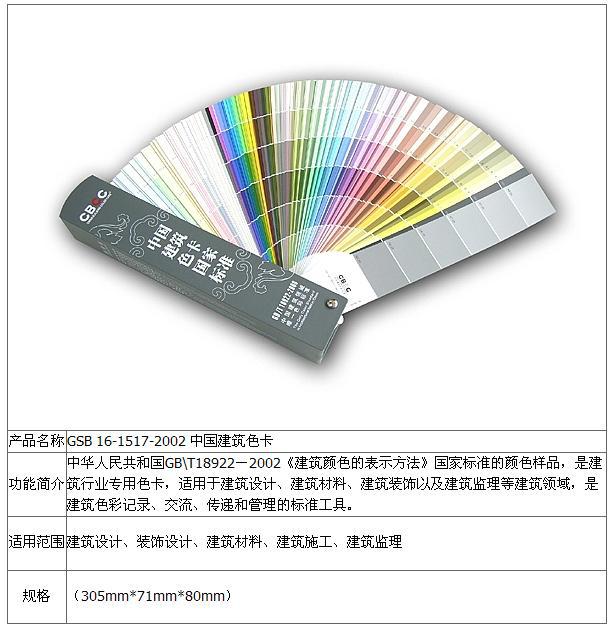 《中国建筑色卡》是按照确定的颜色量值制成的颜色实物标准样品,它不但具有严谨的颜色数量值,是表述中国建筑颜色的科学化、现代化的国家标准工具,而且使中国的建筑色彩标准适时地迈向了标准的、国际化的轨道,为中国的建筑色彩树立了一个新的里程碑。《中国建筑色卡》成为中华人民共和国GB/T18922-2008中国建筑色卡标准样品。《中国建筑色卡》根据国内工厂自身的特点,建立了“标准色浆及相关技术规范”、“先进涂料调色一体化生产线”、“涂料基础漆配方技术与质量评估标准”以及“基于互联网的网络一体化调色系统”,不仅大大地节省了颜色的成本,而且在标准化的实施中,与各企业结成技术产业联盟