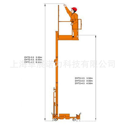 型 号 | | DYT2-3.5 | DYT2-4.0 | DYT2-4.5 | 安全工作载荷 | kg | 200 | 最大工作高度 | mm | 5500 | 6000 | 6500 | 最大平台高度 | mm | 3500 | 4000 | 4500 | 整机长度 | mm | 1300 | 整机宽度 | mm | 840 | 整机高度 | mm | 1660 | 1830 | 1990 | 工作平台尺寸 | mm | 900X600 | 最小离地间隙 | mm | 30 | 轴距 | mm | 770 | 起升电机 | | 12VDC/1.5kw | 上升/下降速度 | sec | 15/17 | 18/20 | 21/23 | 蓄电池 | | 12V/120Ah | 充电器 | | 12A/15A | 后轮 | mm | Ф150×40 | 前轮 | in | 5 | 整机重量 | kg | 265 | 315 | 365 |