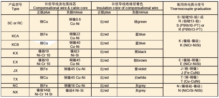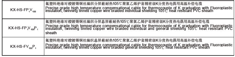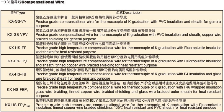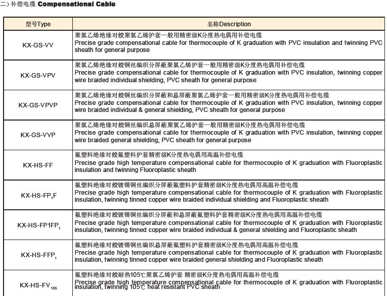 注:1、其它型号补偿导线如:KC、JX、SC、EX、NC、T X等,只需改写型号的第一项,如:EX-G-VV、TX-H-FVP等;